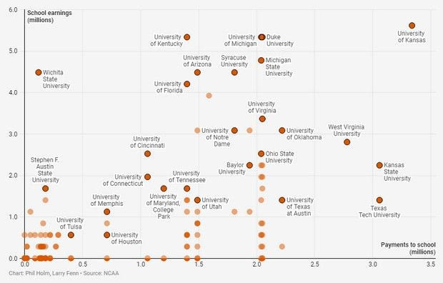 Σε ό,τι αφορά το Michigan State, όπως θα δεις από τον πίνακα που ακολουθεί και δείχνει πού βρίσκεται το κάθε πανεπιστήμιο σε σύγκριση των εσόδων του σχολείου και αυτών που παίρνει από το NCAA, οι Spartans είναι περίπου ίσα βάρκα, ίσα πανιά. Kαι αν οι παίκτες δεν πήραν δολάριο για την πρόκριση στο Final Four, ο προπονητής τους έλαβε 100.000 δολάρια από το κολέγιο και 25.000 δολάρια από τη Nike.