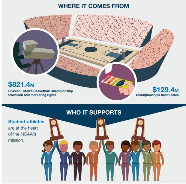 Το NCAA Tournament του 2018 είχε έσοδα 844.300.000 δολάρια, από δικαιώματα για την τηλεόραση και το marketing. Κάθε χρόνο το συμβόλαιο με το CBS και το Turner Sports αυξάνεται. Η τελευταία επέκταση που θα αρχίσει από το 2024, ήταν για 8.8 δισεκατομμύρια δολάρια και οκτώ χρόνια.