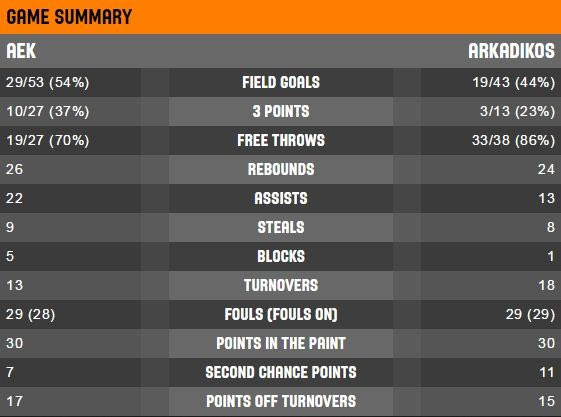 Αρκαδικός: Καραμαλέγκος, Τζόουνς 15, Καββαδάς 18 (5 ρ), Βαν Όστρουμ 9 (5 ρ), Κοψαύτης, Στεφανίδης 8, Τζόουνς 4, Νουούτινεν 2, Καλλινικίδης 6, Εζόμο, Λι 9 (5 ασ), Λίτζιον 3.
