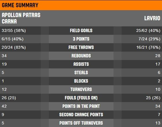 Απόλλων Πάτρας: Αργυρόπουλος 10 (5 ρ), Βεργίνης 17, Μαστρογιαννόπουλος, Πάλμπλαντ 2, Τζαουάρα 10 (6 ασ), Ντίλαρντ 20 (4 ασ), Πελεκούδας, Κουζέλογλου 3, Μπαζίνας, Μάιερ 12 (6 ρ), Σάντλερ 10, Γουντς 6 (7 ρ).