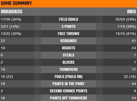Άρης: Γουάιτ 11(2), Γουότερς 8, Ζάρας 12(2), Χάγκινς 18(6/6δ), ΜακΝιλ 16(2τρ, 6ρ, 3ασ), Ξανθόπουλος 2(6ασ), Πελεκάνος 4, Τσούπκοβιτς 7(1), Φλιώνης 1, Κοέν 5, Μούρτος 6(7ρ, 4ασ), Σίμτσακ