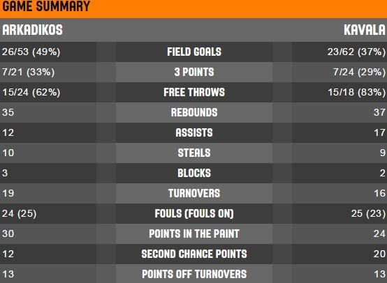Ο Αρκαδικός πήρε από νωρίς το προβάδισμα χάρη στην επιθετικότητα των παικτών του. Ο Νούτινεν και ο Καββαδάς συνείσφεραν αρκετά στο σκοράρισμα στην πρώτη περίοδο, που βρήκε τους γηπεδούχους μπροστά με 21-16. Στο δεύτερο δεκάλεπτο η Καβάλα το πάλεψε, όμως δεν μπόρεσε να μειώσει τη διαφορά. Μια διαφορά που όσο περνούσε η ώρα αυξανόταν. Η ομάδα του Στιβ Γιατζόγλου αγωνίστηκε με πάθος στο τελευταίο δεκάλεπτο, αλλά ο Αρκαδικός με όπλο του την πολύ καλή άμυνα κατάφερε να πάρει τη νίκη.