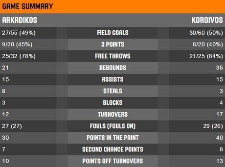 Κόροιβος: Ντέιβις 16(1), Πουλιανίτης, Χριστοδούλου 9(1), Χάρτνινγκ, Χαριτόπουλος 11, Τρότερ 10(1), Γεωργάκης, Σλαφτσάκης 2, Βασιλόπουλος 2, Κάουνσιλ 15(3), Χάρις 20(2).