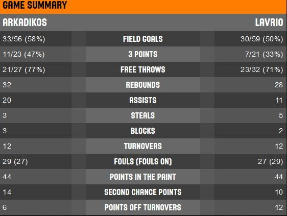 Ο Αρκαδικός κυριάρχησε στο παιχνίδι και έλεγξε τον ρυθμό από την έναρξη της αναμέτρησης. Από την στιγμή, μάλιστα, που η διαφορά ξέφυγε με διψήφιο αριθμό (32-22 στο 13′), το Λαύριο παραδόθηκε στις… ορέξεις των γηπεδούχων. Η διαφορά πήγε και στο +19 (59-40) στο 23′, με το Λαύριο να μειώνει την διαφορά στο τέλος.