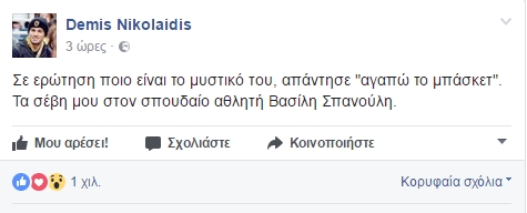 Αυτό άκουσε ο Ντέμης Νικολαΐδης και αντέδρασε εκφράζοντας το σεβασμό του στον αρχηγό των “ερυθρολεύκων”. “Σε ερώτηση ποιο είναι το μυστικό του, απάντησε “αγαπώ το μπάσκετ”. Τα σέβη μου στον σπουδαίο αθλητή Βασίλη Σπανούλη”.