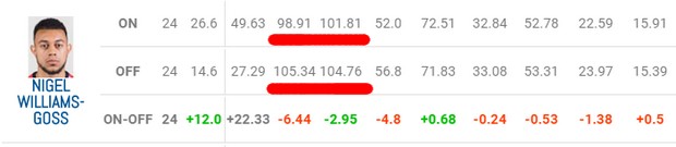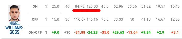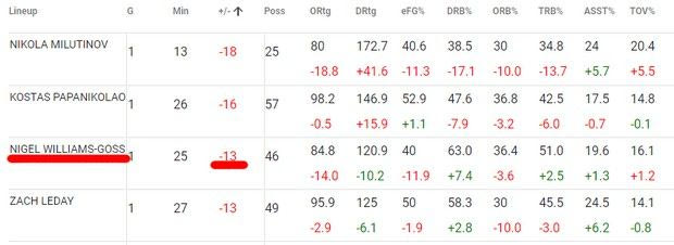 Ο Γουίλιαμς-Γκος έπαιξε σχεδόν 25 λεπτά σε 10 από τις 28 (!) διαφορετικές 5άδες που επέλεξε ο προπονητής του, με τη χειρότερη να τον έχει μέσα, και σ’ αυτό το διάστημα ο Ολυμπιακός κατέληξε στο -13.