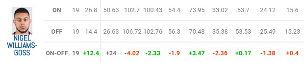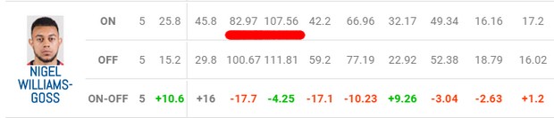 Στον αγώνα με τους Μοσχοβίτες ο Γουίλιαμς-Γκος είχε σκοράρει για πρώτη φορά στο 32′, μ’ ένα σουτ από τα 7 μέτρα, και συνολικά σε 24’33” τέλειωσε με 2 πόντους από 1/6 προσπάθειες και μόλις 2 τελικές πάσες για 1 λάθος.