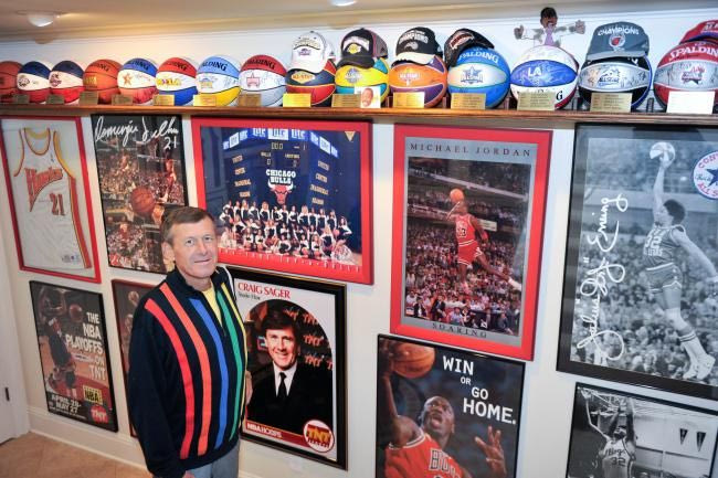 (Ο Σάγκερ στο υπόγειο του σπιτιού του με αναμνηστικά δώρα από το ΝΒΑ)
