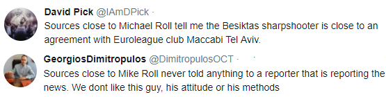 Αρχικά ο Δημητρόπουλος το πρωί της Κυριακής με τουίτ ανέφερε οτι ο Ρολ δεν έκανε χρήση της οψιόν για παραμονή στη Μπεσικτάς και πλέον είναι ελεύθερος, αλλά και ότι τη Δευτέρα θα ανακοινωθεί η επόμενη ομάδα του. Δύο ώρες αργότερα ο Πικ “τιτίβισε” πως σύμφωνα με πηγές (του) κοντά στο παίκτη η επόμενη ομάδα του Ρολ θα είναι η Μακάμπι Τελ Αβίβ για να αντιδράσει ο Δημητρόπουλος απαντώντας: