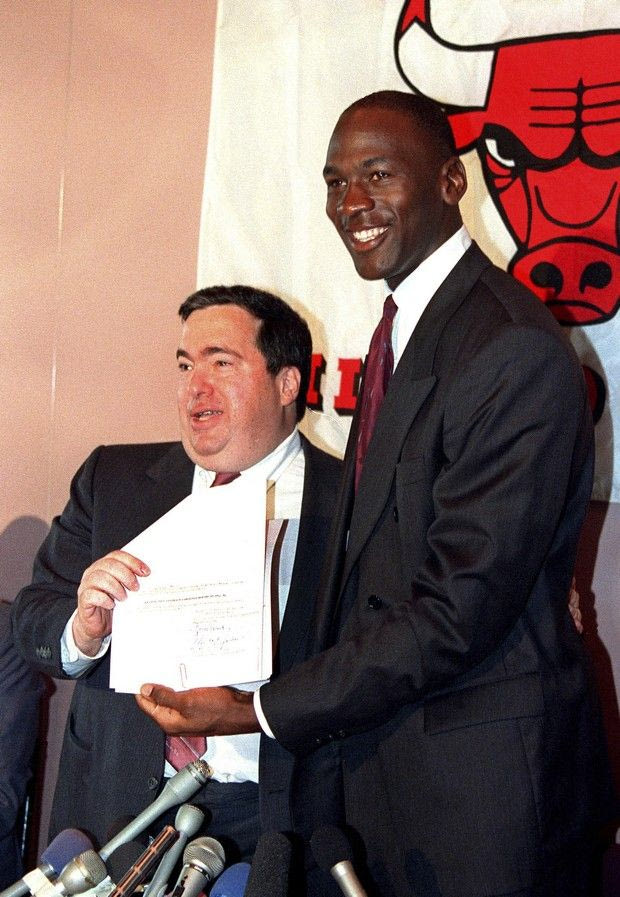FILE - In this Sept. 21, 1988, file photo, Chicago Bulls' Michael Jordan, right, is all smiles after he signed a new contract with the NBA basketball team as general manager Jerry Krause looks on during a news conference in Chicago, Ill. Krause, the executive behind the Bulls' six NBA titles, has died, the team announced Tuesday, March 21, 2017. He was 77. (AP Photo/Mark Elias, File) AP