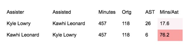 O Leonard παίρνει ασίστ από τον Lowry κάθε 17.6” -σύνδεση που δεν είχε ο τελευταίος με τον DeRozan (ήταν 19.8 τα λεπτά). Με τους δυο τους στο παρκέ, η ομάδα τους σκοράρει 118 πόντους, ανά 100 κατοχές -με τον DeRozan ήταν 112.5. Είναι η δεύτερη καλύτερη επίδοση, μετά τους 118.7 των Curry και Durant στους Warriors (118.7).