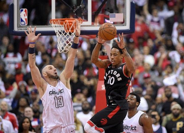 Toronto Raptors guard DeMar DeRozan (10) passes the ball against Washington Wizards center Marcin Gortat (13) during the second half of Game 4 of an NBA basketball first-round playoff series, Sunday, April 22, 2018, in Washington. The Wizards won 106-98. (AP Photo/Nick Wass) AP