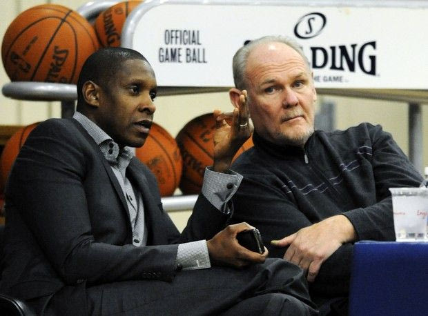 Denver Nuggets Executive Vice President of Basketball Operations Masai Ujiri, left, talks with head coach George Karl during the first day of NBA basketball training camp in Denver, Friday, Dec. 9, 2011. (AP Photo/Jack Dempsey) ASSOCIATED PRESS