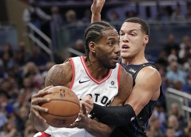 Toronto Raptors' Kawhi Leonard, left, makes a move to get around Orlando Magic's Aaron Gordon during the first half of an NBA basketball game, Tuesday, Nov. 20, 2018, in Orlando, Fla. (AP Photo/John Raoux) AP