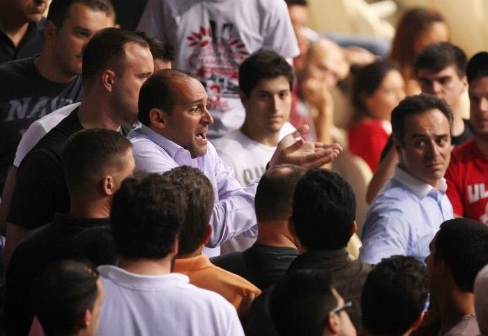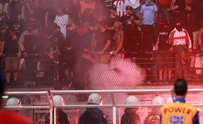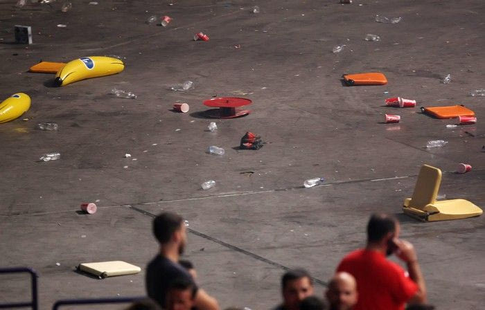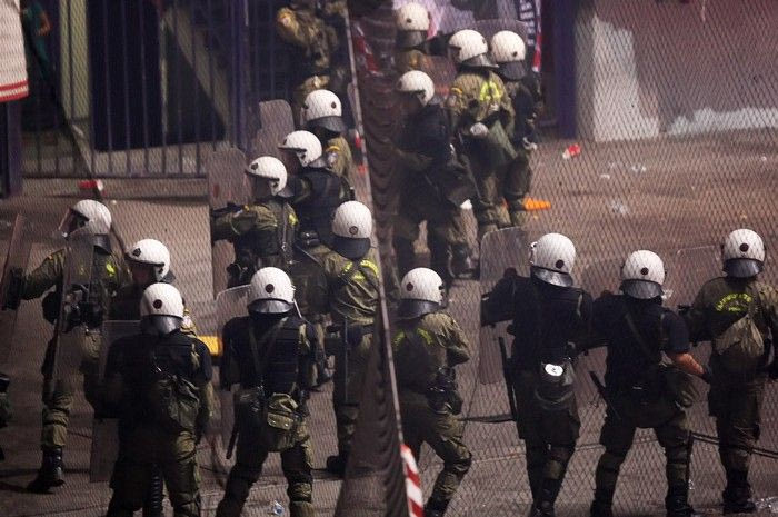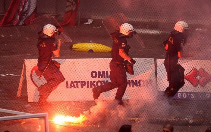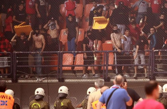 Βομβαρδισμένο τοπίο θύμιζε το Στάδιο Ειρήνης και Φιλίας λίγο μετά από τη διακοπή του τελικού μεταξύ Ολυμπιακού και Παναθηναϊκού. Καρέκλες, αντικείμενα, κροτίδες, φωτοβολίδες κείτονταν στο παρκέ και οι δυνάμεις των ΜΑΤ προσπαθούσαν να εκκενώσουν τις εξέδρες.