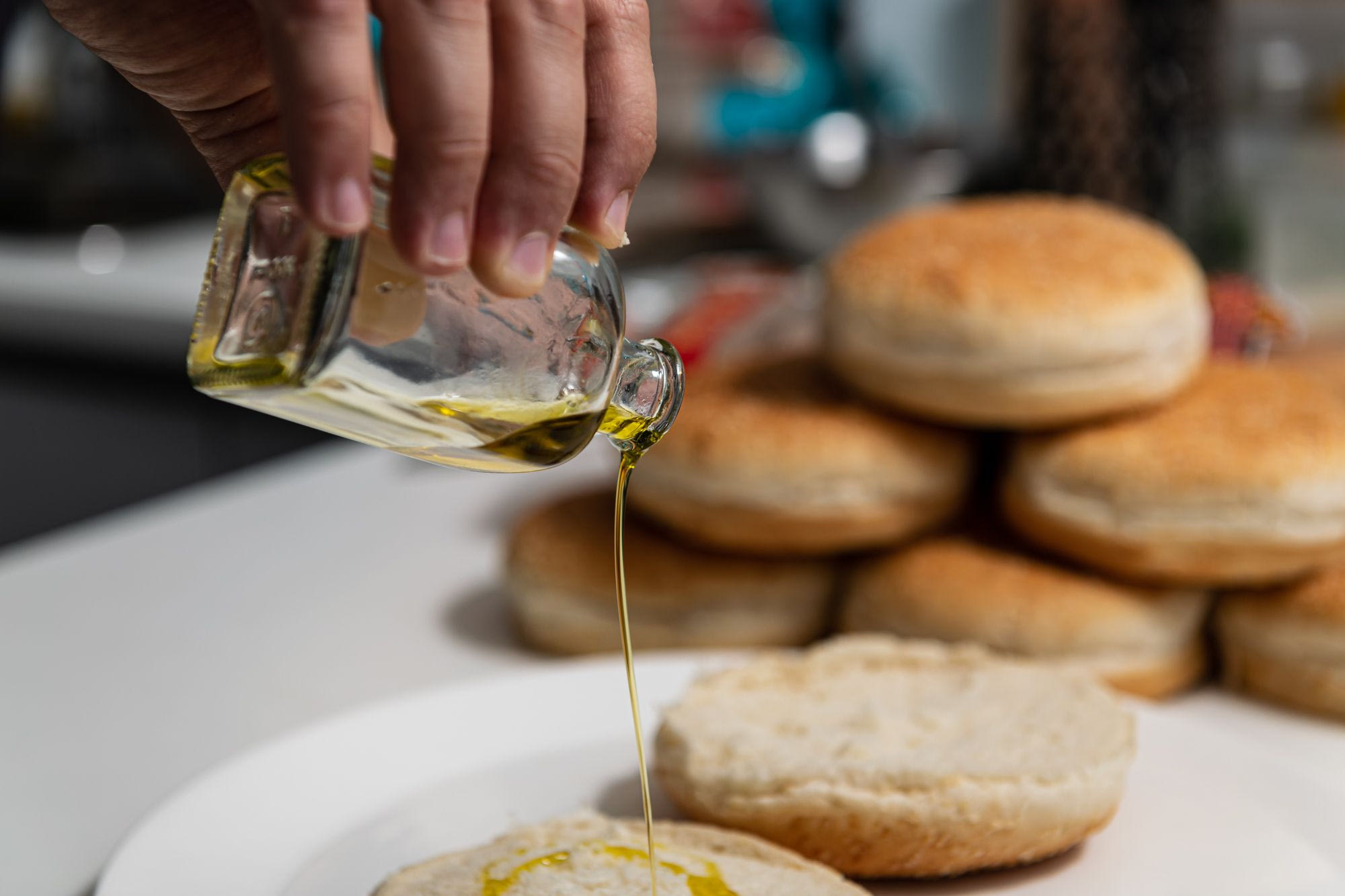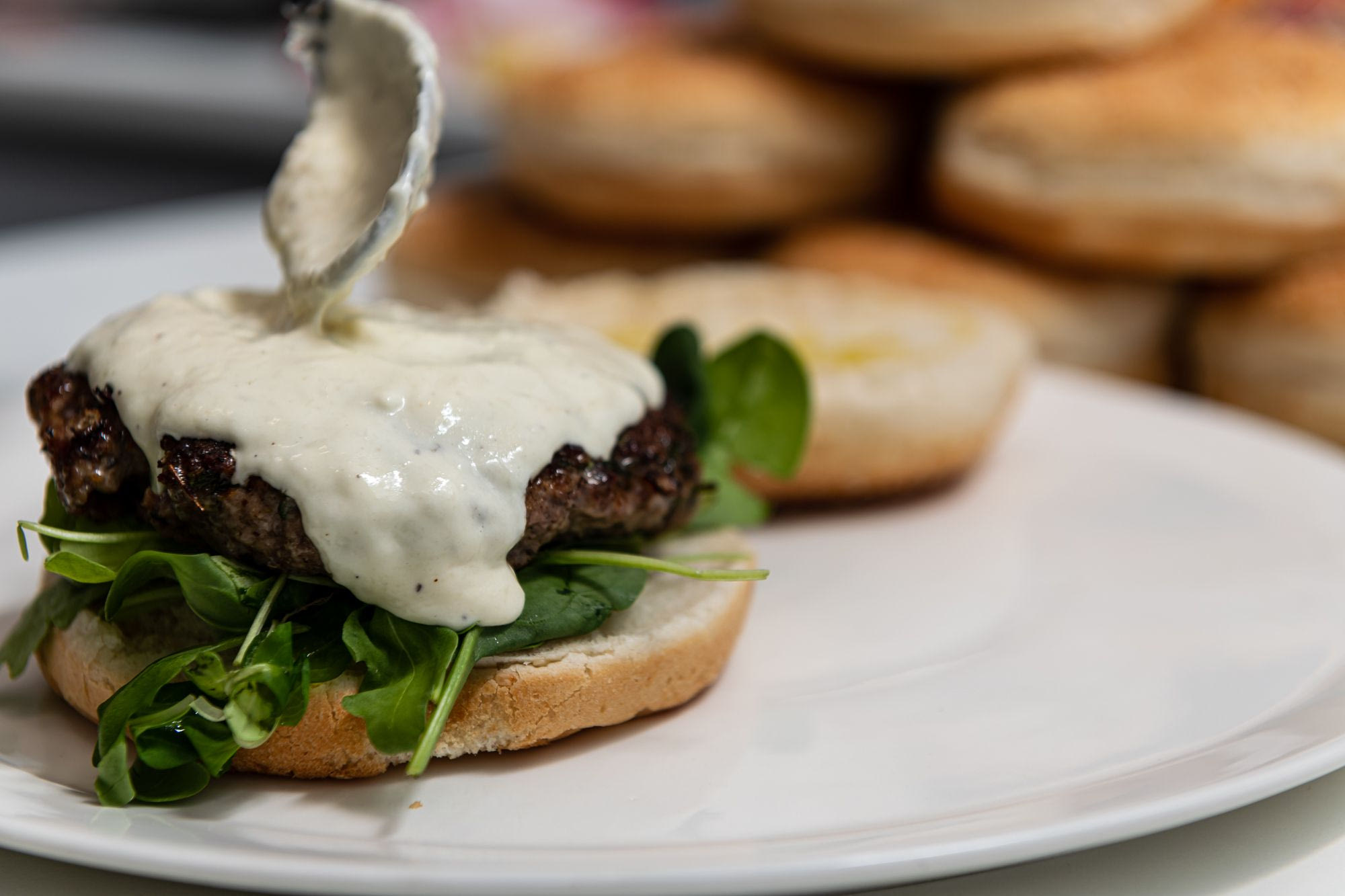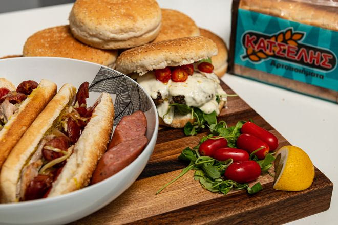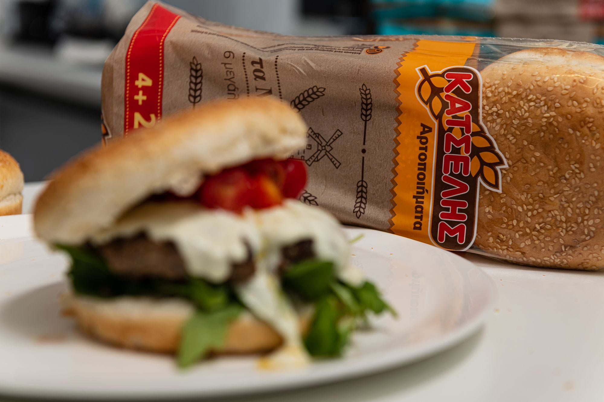 Βurger με ελληνικό μπιφτέκι, κρέμα γραβιέρας και μαριναρισμένα τοματίνια