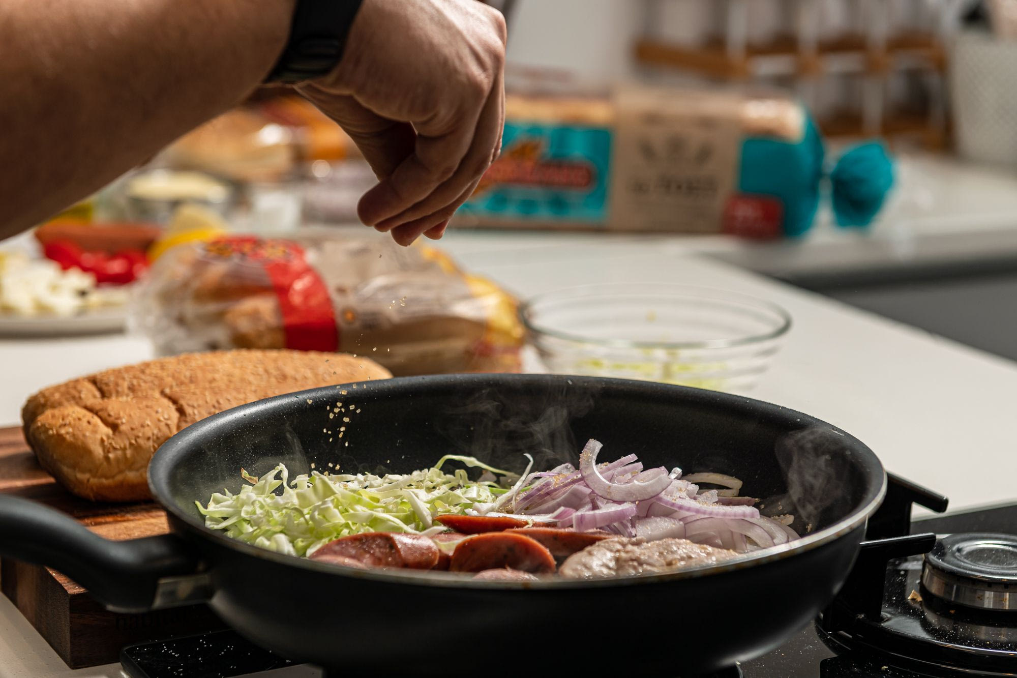 Σε ένα αντικολλητικό τηγάνι λιώνουμε το βούτυρο, προσθέτουμε τα λουκάνικα, το κοτόπουλο φιλέτο, το κρεμμύδι και το λάχανο και ψήνουμε ανακατεύοντας συνέχεια.