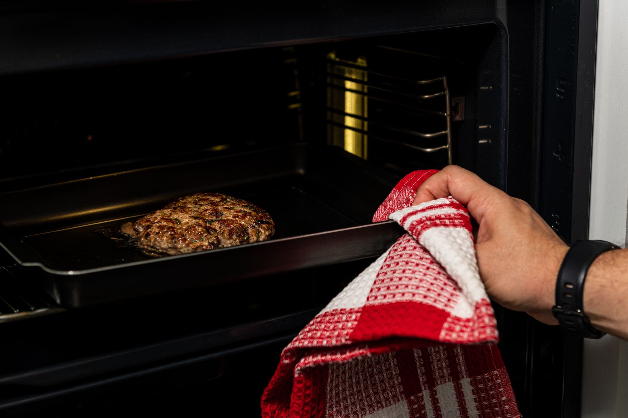 Σε ένα αντικολλητικό τηγάνι σωτάρουμε το μπιφτέκι και από τις δύο πλευρές και το τελειώνουμε στο φούρνο για 10 λεπτά στους 160 βαθμούς.