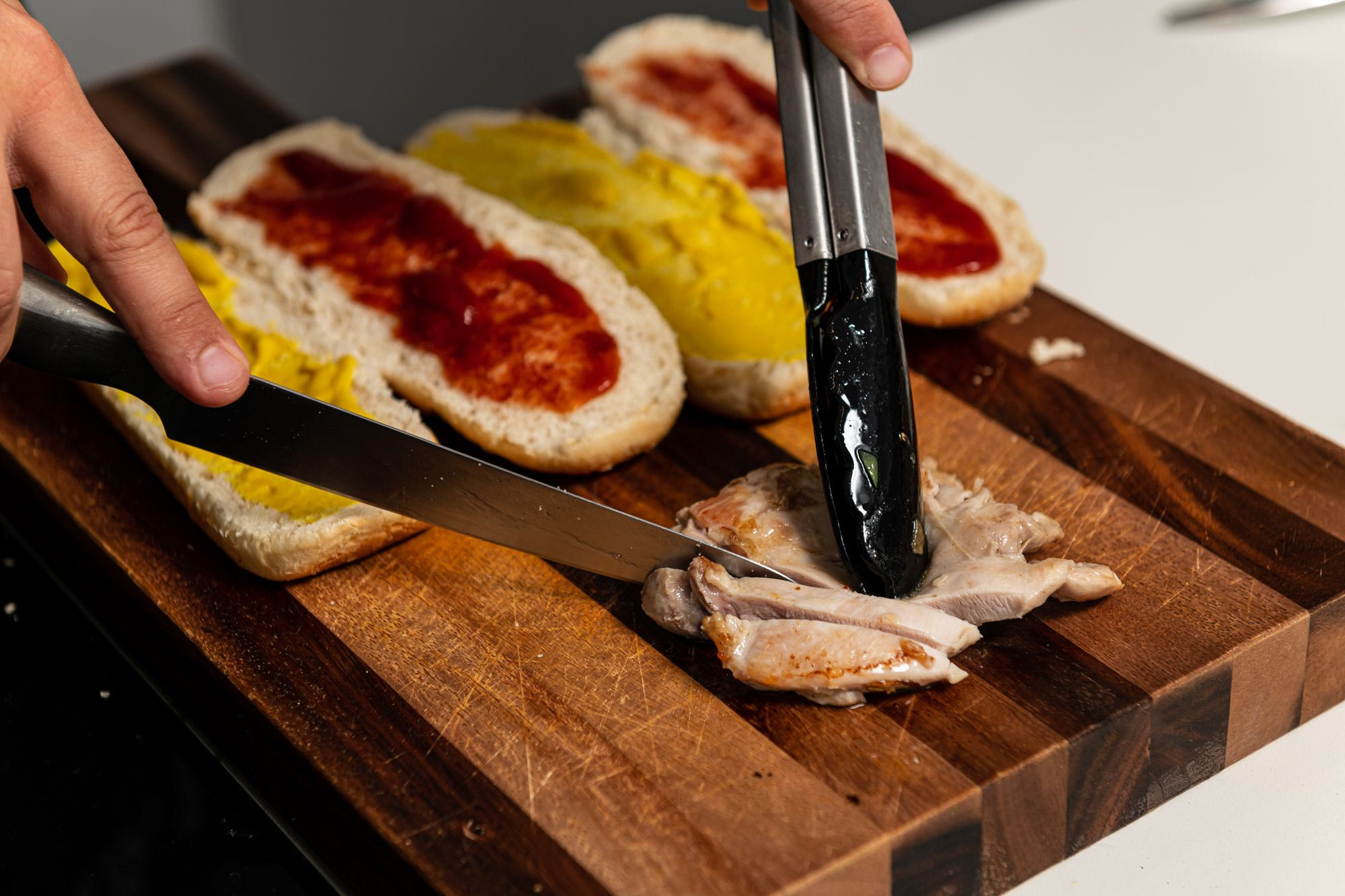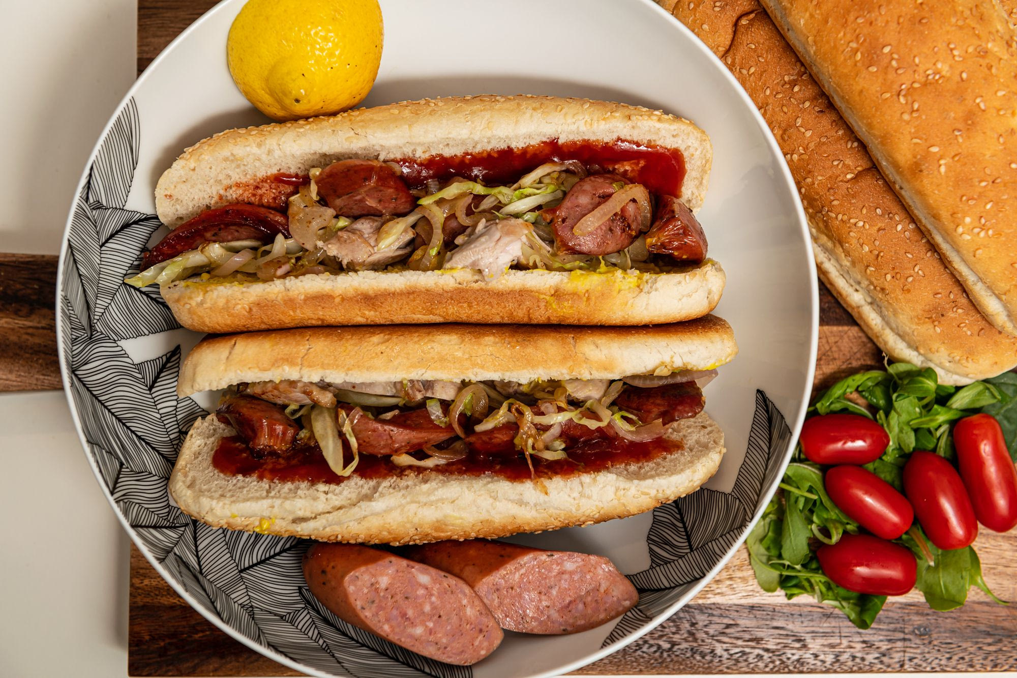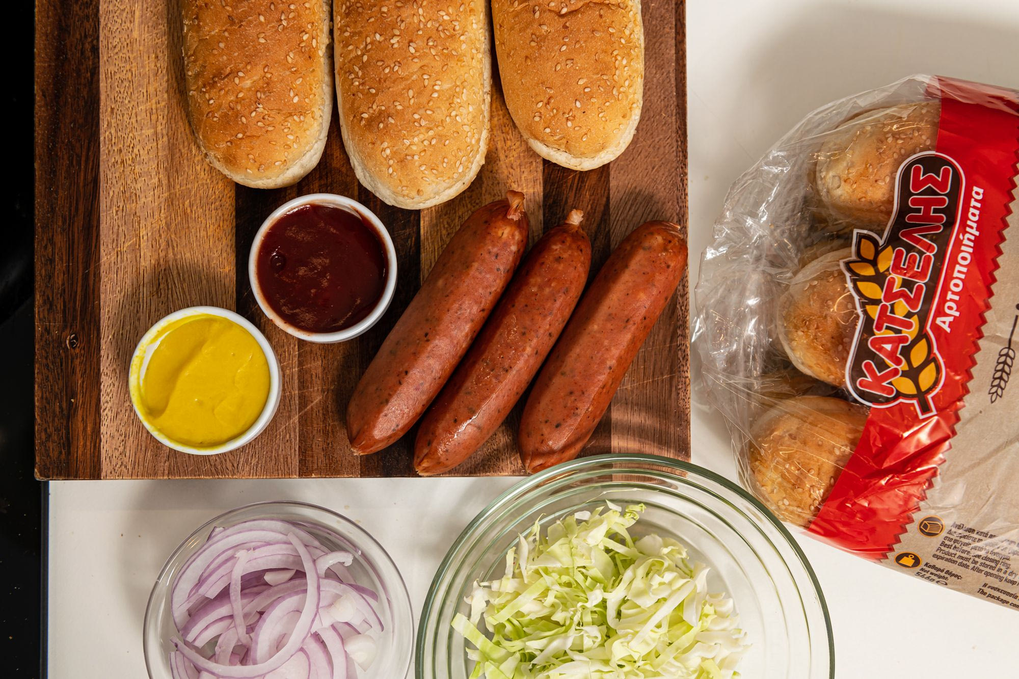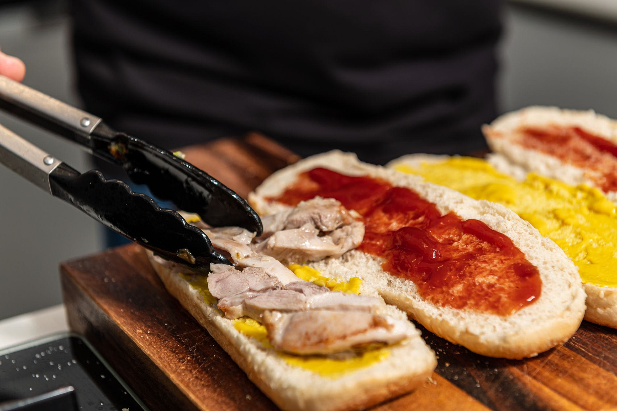 Μοιράζουμε το κοτόπουλο, το λουκάνικο και τα υπόλοιπα λαχανικά στα δύο sandwich και σερβίρουμε.