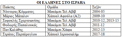 Ο πρώτος Έλληνας που πήγε στο Ισραήλ ήταν για λογαριασμό της Μακάμπι Τελ Αβίβ ο Νέστορας Κόμματος ο οποίος μάλιστα εκείνη τη σεζόν κατέκτησε και την Ευρωλίγκα στο φάιναλ-φορ της Μόσχας.