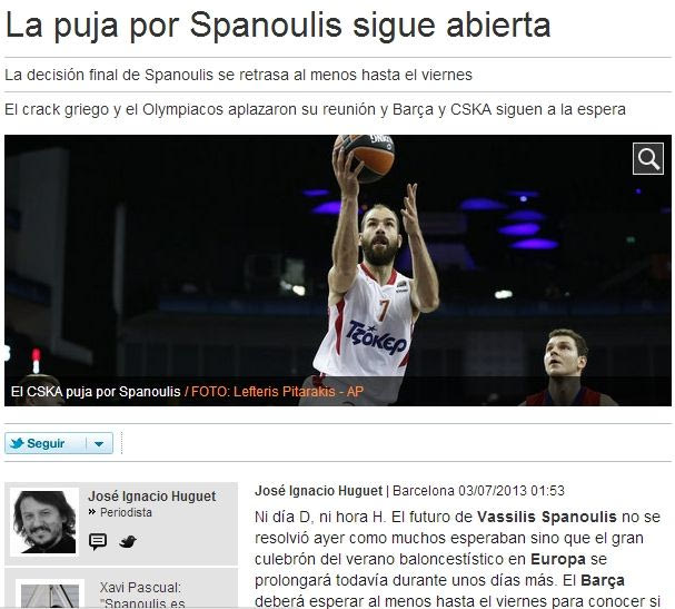 Η Μπαρτσελόνα είναι μία ομάδα που εκφράζει τον Σπανούλη, λόγω της ιστορίας της, ενώ ανασταλτικός παράγοντας για την ΤΣΣΚΑ αποτελεί η απόσταση, αλλά και πολλά ταξίδια της ομάδας για το ρωσικό πρωτάθλημα. Καταλανοί και Ρώσοι πιστεύουν ότι ο Σπανούλης θα τους δώσει την ώθηση, προκειμένου να κατακτήσουν το πρωτάθλημα Ευρώπης. Οι Ισπανοί προσφέρουν το όνομα, οι Ρώσοι το χρήμα και ο Ολυμπιακός την ασφάλεια. Διαλέγει και παίρνει…