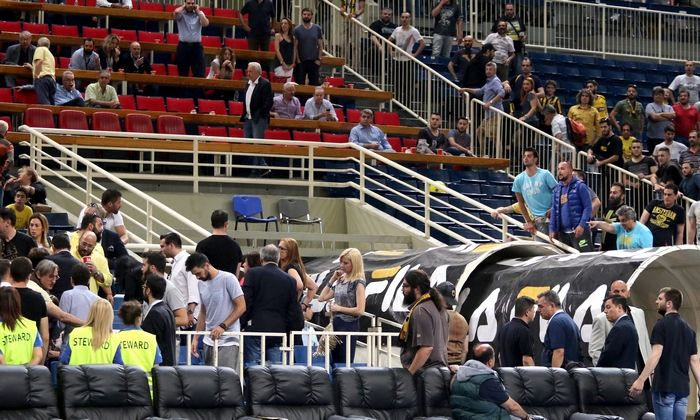 “Άναψαν τα αίματα” στις εξέδρες του ΟΑΚΑ κατά τη διάρκεια της ανάπαυλας στην αναμέτρηση της ΑΕΚ με τον Άρη για τους μικρούς τελικούς της Basket League.