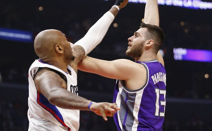 Sacramento Kings center Georgios Papagiannis shoots over Los Angeles Clippers center Marreese Speights, left, during the first half of an NBA basketball game, Sunday, March 26, 2017, in Los Angeles. (AP Photo/Danny Moloshok) AP