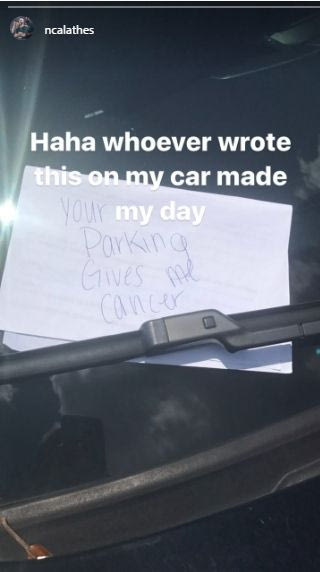 Ένας απίθανος τύπος άφησε σημείωμα πάνω στο παρμπρίζ του “πράσινοι” άσο στο οποίο αναφέρει: “Μου έχεις βγάλει τον… καρκίνο με το παρκάρισμα σου” και τον Καλάθη να σχολιάζει πως του έφτιαξε τη μέρα με την ατάκα του.