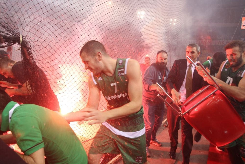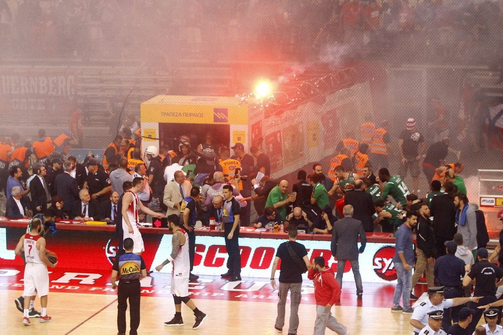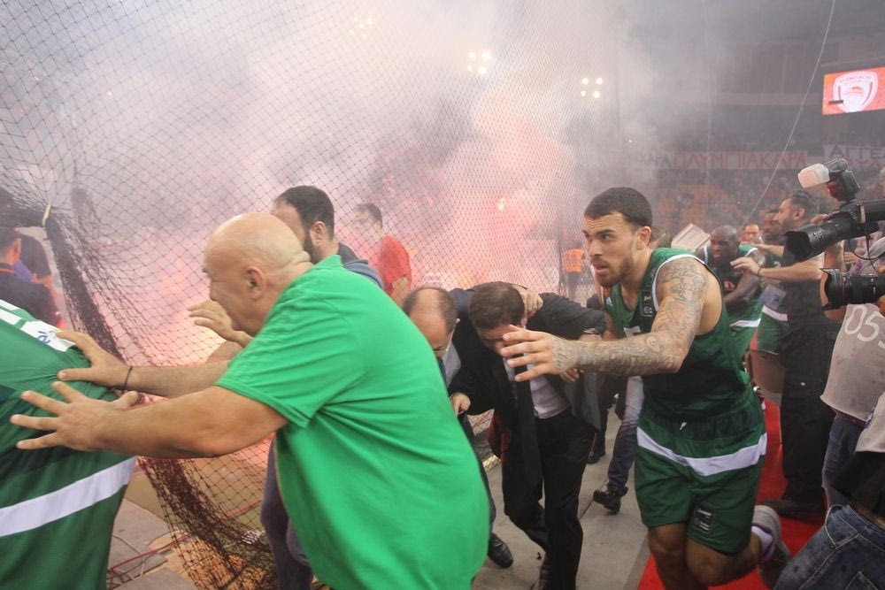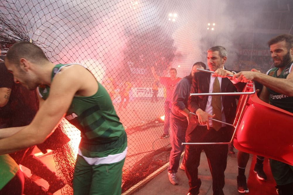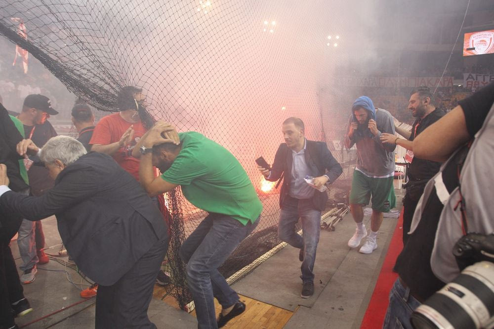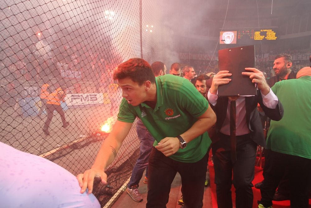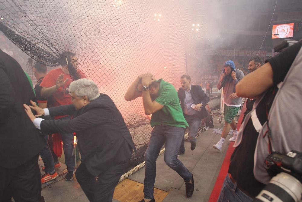 Στο 1:58 του αγώνα ανάμεσα σε Ολυμπιακό και Παναθηναϊκό το παιχνίδι διεκόπη, μετά από ρίψη αντικειμένων. Δείτε μέσα από φωτογραφίες πως οι παίκτες των "πράσινων"... απέδρασαν από το φλεγόμενο παρκέ.