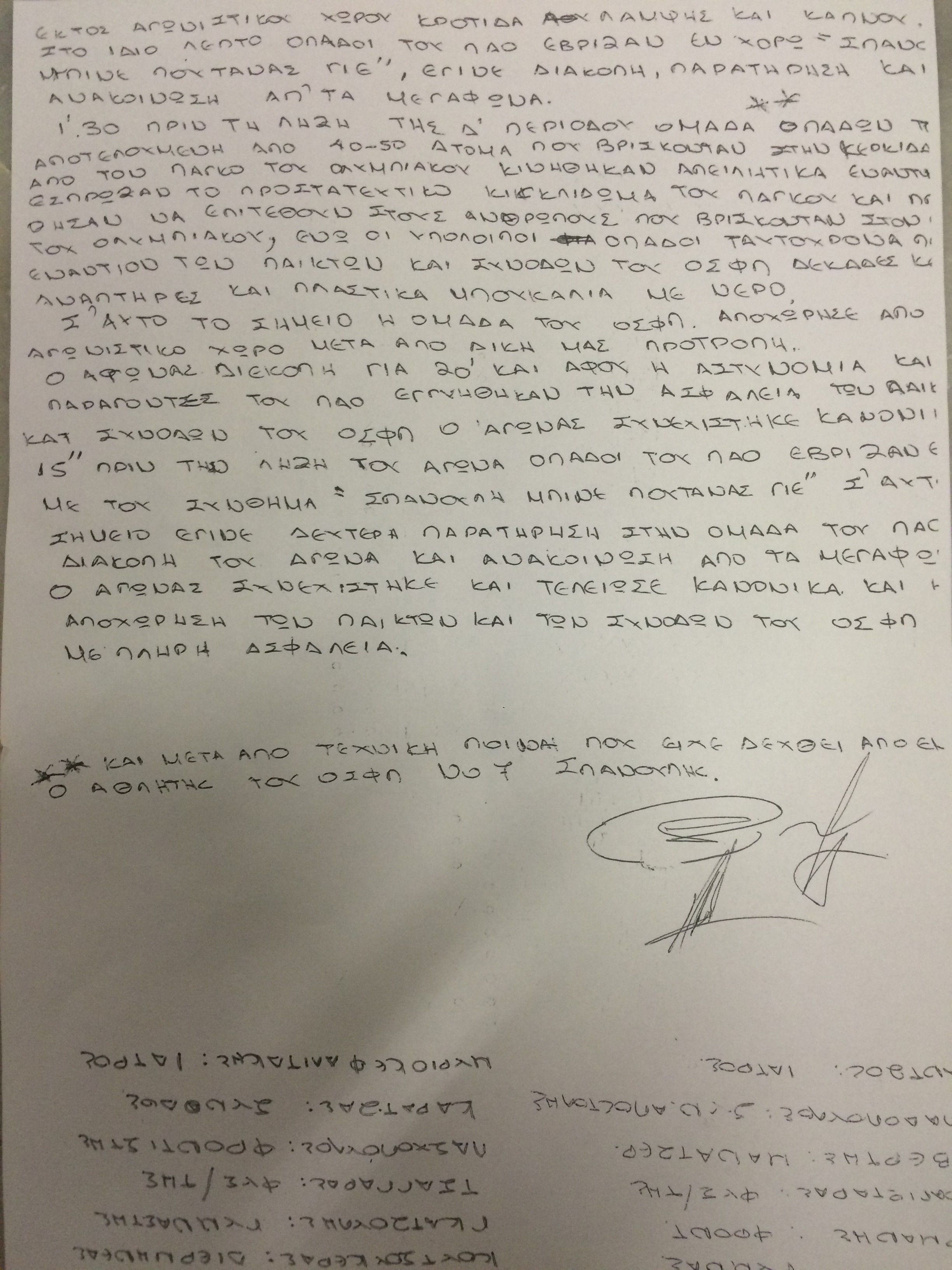 Αν και δεν γράφηκε στο φύλλο αγώνα ως χειρονομία και μόνο ως απλή τεχνική ποινή, από τον Παναθηναϊκό περιμένουν να επισημανθεί στη συμπληρωματική έκθεση η επίμαχη χειρονομία πριν η υπόθεση καταλήξει στον αθλητικό δικαστή.