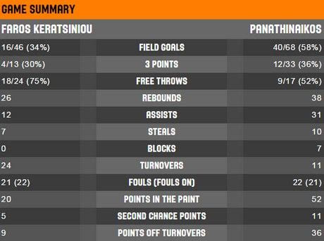 Παναθηναϊκός: 10/11 δίποντα, 3/8 τρίποντα, 2/2 βολές, 10 ριμπάουντ, 10 ασίστ, 2 λάθη, 2 κλεψίματα, 2 τάπες.