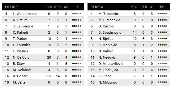 Γαλλία: 37 πόντοι, 8/9 βολές (88.9%), 10/27 δίποντα (37%), 3/10 τρίποντα (30%), 22 ριμπάουντ, 7 ασίστ, 5 λάθη, 4 κλεψίματα, 13 κερδισμένα φάουλ.