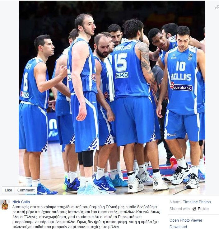 Ο Νίκος Γκάλης έγραψε, ως είθισται, μήνυμα στο facebook, αυτή τη φορά συμπαράστασης για την Εθνική ομάδα και τον αποκλεισμό από την Ισπανία.