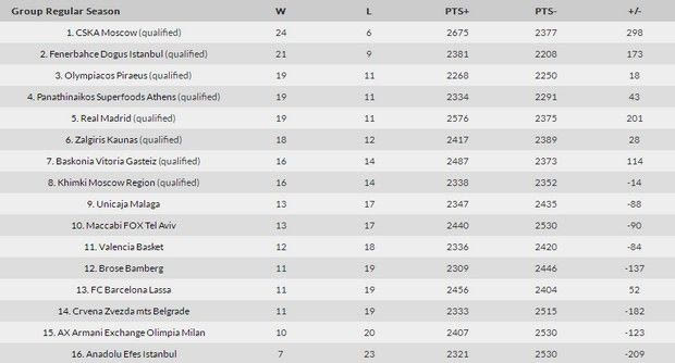 H βαθμολογία της Ευρωλίγκα μετά από 30 αγωνιστικές