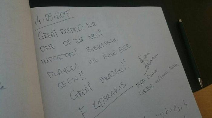 Μάλιστα, ο ομοσπονδιακός τεχνικός, Φώτης Κατσικάρης, έγραψε στο βιβλίο επισκεπτών, αποθεώνοντας τον αδικοχαμένο θρύλο του κροατικού μπάσκετ.