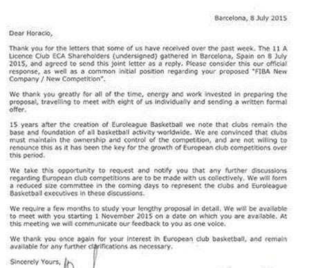 σ’ ευχαριστούμε για τα γράμματα που λάβαμε από εσένα την τελευταία εβδομάδα. Οι έντεκα (11) ομάδες που έχουν συμβόλαιο τύπου Α συγκεντρωθήκαμε στα κεντρικά της Euroleague στη Βαρκελώνη, την Τρίτη 8 Ιουλίου, και συμφωνήσαμε να σου στείλουμε το παρακάτω ως απάντηση. Παρακαλούμε να λάβετε υπ’ όψιν ως επίσημη απάντηση από εμάς, όπως επίσης ως τοποθέτηση για τη “νέα διοργάνωση της FIBA”.