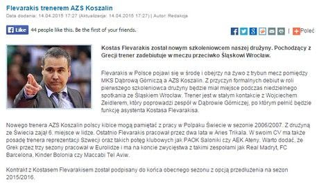 Την πρόσληψη του Κώστα Φλεβαράκη ανακοίνωσε την Τρίτη του Πάσχα η πολωνική Κόζαλιν!