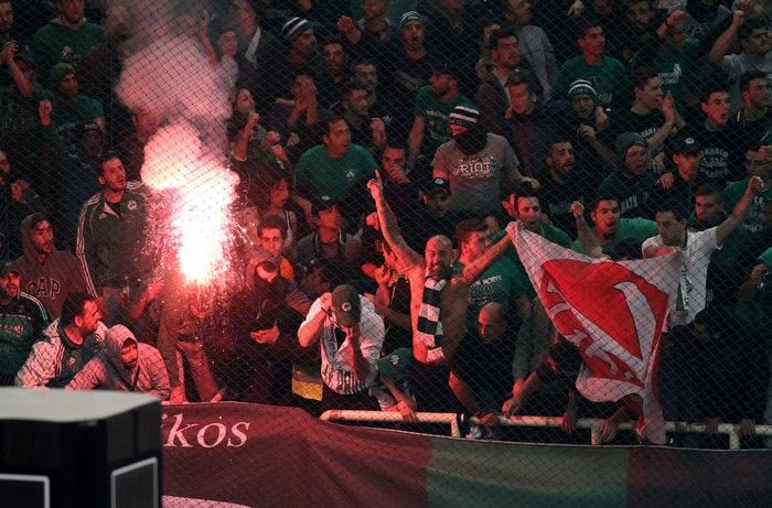 Εντός του γηπέδου, ακόμα και 90 λεπτά πριν από το τζάμπολ, είχε διαμορφωθεί σκηνικό αρένας. Το μεγάλο δίχτυ πίσω από τις δύο μπασκέτες είχε υψωθεί, ο οχετός των ύβρεων είχε μόλις αρχίσει κι όλα έπαιρναν το γνωστό φιλοπολεμικό δρόμο. Οι δύο προπονητές, πάντως, ως κύριοι που σέβονται τον εαυτό τους, και χειραψία αντάλλαξαν πριν από το παιχνίδι και το καλό παράδειγμα έδωσαν με τη συμπεριφορά τους. Όπως κι οι παίκτες. Τι τα θες, τι τα γυρεύεις όμως; Να σου πάλι οι κροτίδες, να τα βεγγαλικά που στόχευαν κεφάλια, να η αναστάτωση, να κι η αποχώρηση του Ολυμπιακού από το παρκέ. Ούτε το πνεύμα των Χριστουγέννων βοηθά τους σκληρούς της εξέδρας να χαλαρώσουν.