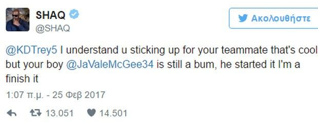 Σαν να ξεφεύγει η κατάσταση στη διαμάχη του Τζαβέιλ ΜακΓκι με τον Σακίλ Ο’Νιλ. Ο Κέβιν Ντουράντ παρενέβη και σχολίασε τις αισχρές κουβέντες που αντάλλαξαν οι δύο άνδρες και επειδή υπερασπίστηκε τον συμπαίκτη του στους Γουόριορς μπήκε στην… πένα του Shaq. Ο οποίος ούτε που σκέφτηκε με ποιον τα βάζει και συνέχισε τους “λίβελους” με αποδέκτη τον “KD”.