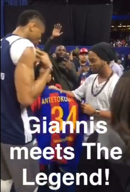 Είναι πλέον επίσημο. Ο Ροναλντίνιο είναι από τους μεγαλύτερους φαν του Γιάννη Αντετοκούνμπο. Μετά τις φωτογραφίες των δυο τους στα πλαίσια του Σαββατοκύριακου του All Star Game στη Νέα Ορλεάνη, ο Βραζιλιάνος προχώρησε και ένα βήμα παραπάνω.