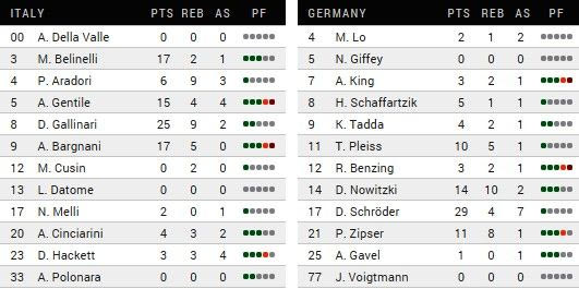 Η Ιταλία νίκησε γιατί… κατάφερε να στείλει το ματς στο έξτρα πεντάλεπτο παρόλο που στη μεγαλύτερη διάρκεια του ήταν σταθερά πίσω, ακόμη και με εννέα πόντους (45-54). Ο Ντανίλο Γκαλινάρι ωστόσο, που πήρε την ευθύνη της τελευταίας προσπάθειας, ευστόχησε από τα έξι μέτρα και οι “ατζούρι” ισοφάρισαν 76-76. Με το μομέντουμ να τους ανήκει πλέον βρήκαν άλλο ένα μεγάλο σουτ με τον Μάρκο Μπελινέλι για το 87-82 και σε συνδυασμό με τα λάθη των Σρέντερ – Νοβίτσκι σε διαδοχικές επιθέσεις πανηγύρισαν άλλη μία μεγάλη νίκη στη διοργάνωση.