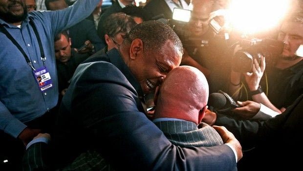 Ο Ντέιβιντ Γκρίφιν, στην αγκαλιά του κόουτς των Πέλικανς, Άλβιν Τζέντρι, μετά το “fuck yeah” που αναφώνησε.