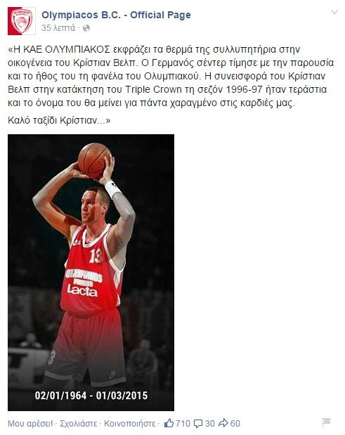“Η ΚΑΕ ΟΛΥΜΠΙΑΚΟΣ εκφράζει τα θερμά της συλλυπητήρια στην οικογένεια του Κρίστιαν Βελπ. Ο Γερμανός σέντερ τίμησε με την παρουσία και το ήθος του τη φανέλα του Ολυμπιακού. Η συνεισφορά του Κρίστιαν Βελπ στην κατάκτηση του Triple Crown τη σεζόν 1996-97 ήταν τεράστια και το όνομα του θα μείνει για πάντα χαραγμένο στις καρδιές μας.
