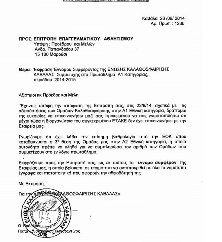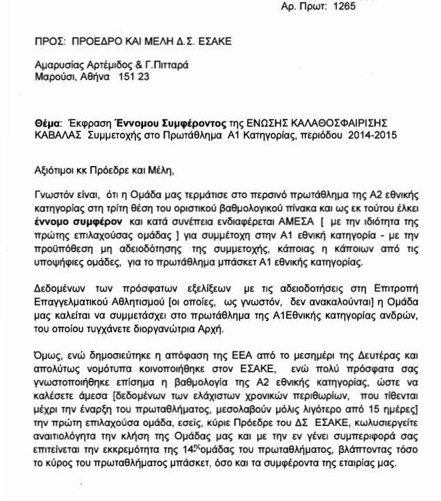 Η επιστολή προς τον ΕΣΑΚΕ