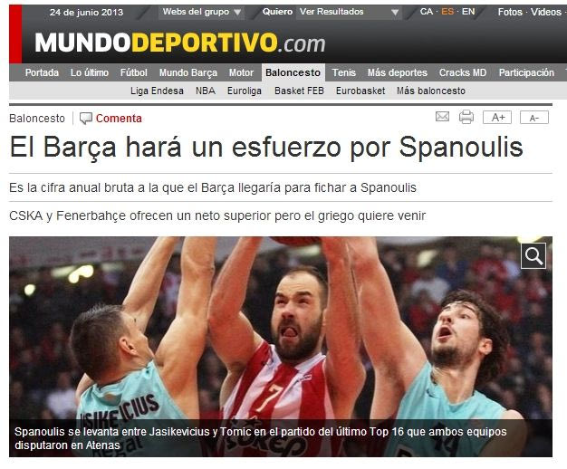 Στη συνέχεια του καταλανικού ρεπορτάζ σημειώνεται πως: “ο Σπανούλης πάντα έλεγε ότι η πρώτη επιλογή του είναι να παραμείνει στην ομάδα από τον Πειραιά, όμως δεν φέρεται διατεθειμένος να το κάνει με οποιοδήποτε ποσό. Ο Ολυμπιακός έκανε μια πρώτη προσφορά για ανανέωση, προσφέροντάς του 1,5 εκ. ευρώ τον χρόνο, η οποία απορρίφθηκε. Τώρα οι πρωταθλητές Ευρώπης βελτιώνουν την προσφορά τους η οποία αγγίζει τα 2 εκατομμύρια ευρώ ετησίως. Είναι δύσκολο όμως οι αδερφοί Αγγελόπουλοι μετά από δύο τίτλους στην Ευρωλίγκα να διατηρήσουν σε υψηλά επίπεδα το μπάτζετ της ομάδας τους.