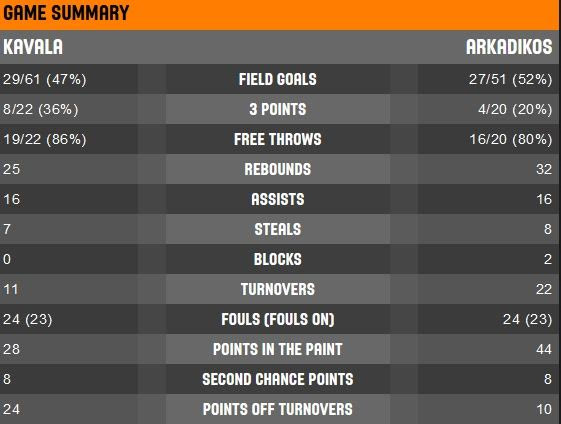 Καβάλα (Γιατοζόγλου): Λέιζερ 14 (8ρ, 5ασ), Κεμπ 6, Βαν Ντερ Μαρς 6, Κοστόβ 12, Γιαννακίδης 14 (3/6τρ), Ταπούτος 11, Καλαϊτζίδης 3, Δεμερτζής 2, Τζόουνς 12, Ρόμπινσον 6.
