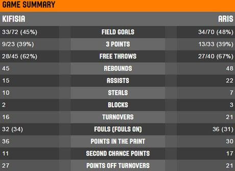 Άρης: Πελεκάνος, Γουάιτ 27(2/6τρ, 9ρ), Χάγκινς 6, Σίμτσακ 3, ΜακΝιλ 9(1/6δ, 0/4τρ, 4ρ, 6ασ), Ξανθόπουλος 3(1), Τσούπκοβιτς, Γουότερς 29(2τρ, 6ρ, 9ασ, 8λ), Ζάρας 10(3/7τρ), Κοέν 13(3/7τρ, 11ρ), Μούρτος 8(2)
