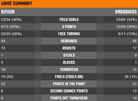 ΚΗΦΙΣΙΑ: 9/20 δίποντα, 2/5 τρίποντα, 20 ριμπάουντ (16+4), 6 ασίστ, 9 λάθη, 4 κλεψίματα, 1 τάπα.