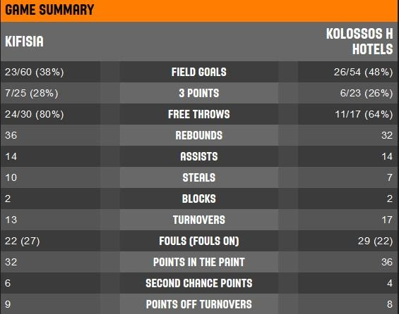 Ο επιθετικός πλουραλισμός της Κηφισιάς (πέντε παίκτες με διψήφιο αριθμό πόντων) έκανε τη διαφορά κόντρα στον αξιόμαχο Κολοσσό. Οι Ρόδιοι πάλεψαν αλλά χάνοντας κατά κράτος τη μάχη των επιθετικών ριμπάουντ (7 λιγότερα) καταδικάστηκαν σε ήττα. Οι επτά παραπάνω κατοχές μέτρησαν πολυ.