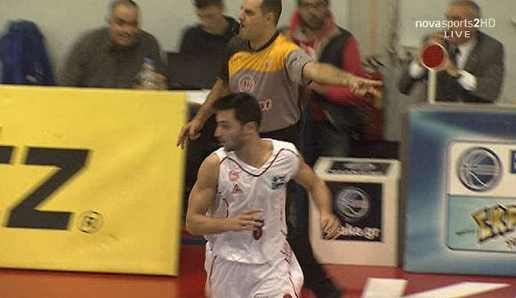 – Η στιγμή που ο Ηλίας Κορομηλάς (πρώτος διαιτητής) χρεώνει για δύο το καλάθι του Νίκου Γκίκα